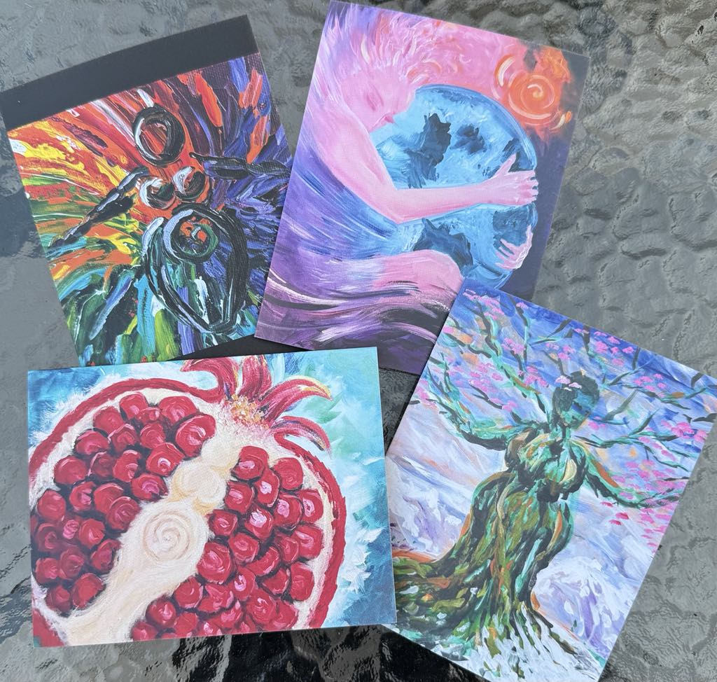 Two of Studio Aurora's favorite symbols of Sacred Feminine abundance -- the Goddess and the Pomegranate -- come together in the original "Pomegoddess" acrylic painting, and has become Studio Aurora's signature image. Each set includes 1 Pomegoddess, 1 Fire goddess, 1 Earth Goddess, and 1 Air goddess. Folded cards are blank inside to invite you to express, in your own words, what's in your heart!