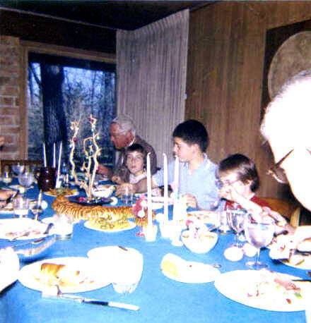 I recently went through old family photos and found one from Easter 1963. Our table is decorated with dyed hard boiled eggs for placecards, a centerpiece with chocolate eggs hanging from a tree branch and a very long bread dragon down the middle of the table!!